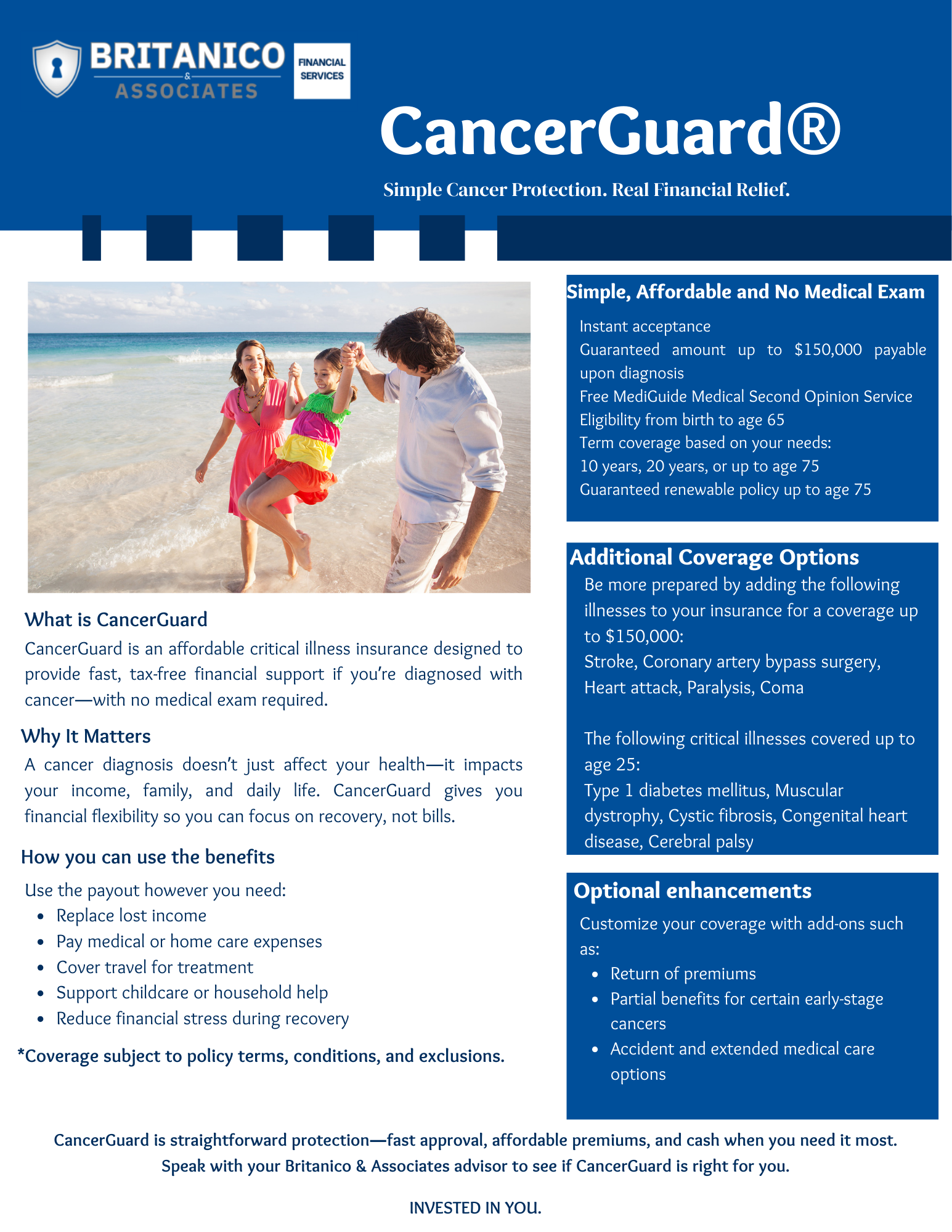 Cancer Insurance pays cash benefits directly to you upon diagnosis or during treatment, depending on the policy. Funds can be used however you choose: